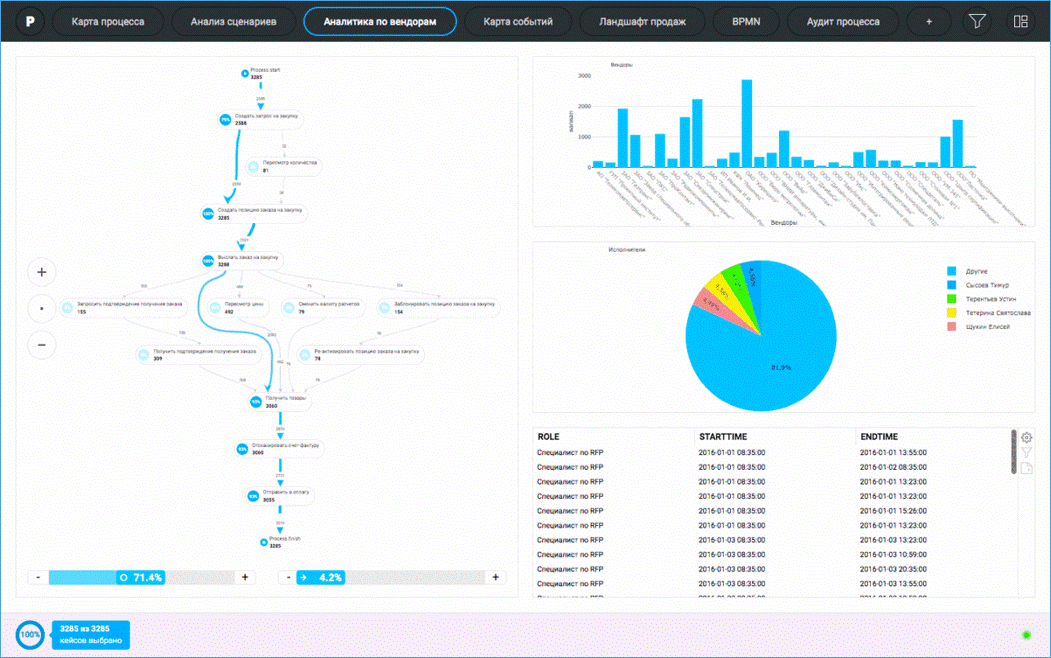 Удобный конструктор аналитических панелей позволит вывести дополнительные данные и KPI процесса. Каждая диаграмма интерактивна, и может служить фильтром модели процесса — и наоборот! Получите за несколько кликов аналитику по процессу работы с самыми крупными контрагентами, узнать производительность труда конкретного подразделения в разрезе по людям и результатам, посмотреть, как распределена нагрузка исполнителей на конкретном шаге, найти точку потерь в процесс и многое другое.
