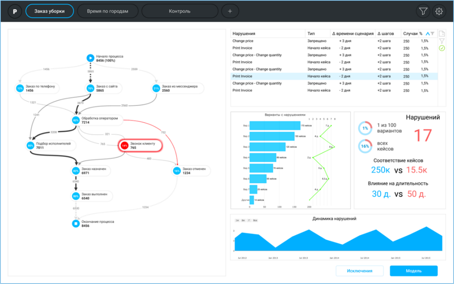 Решение Promease 2.0 позволяет автоматически, быстро и точно получить интерактивную модель процесса из данных информационных систем (ERP, CRM, MRO, электронный документооборот и др.). Система автоматически выявит несоответствия реального процесса регламенту, поможет найти потери в бизнес-процессе и даже подсчитает эффект в метриках денег и времени. Ваша задача — принять нужные управленческие решения.